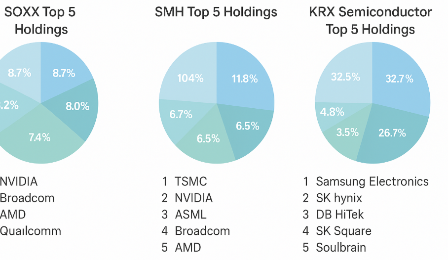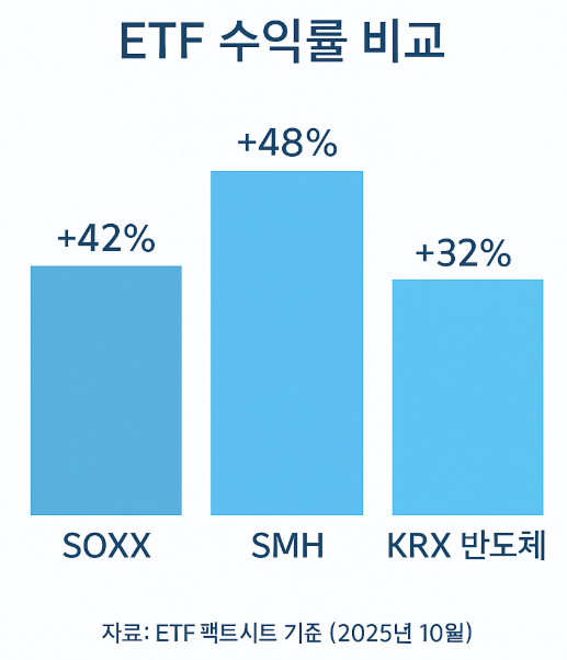 | SMH | VanEck | TSMC, NVIDIA, AMD 중심 | 파운드리 비중 높음, 수익률 상위 |